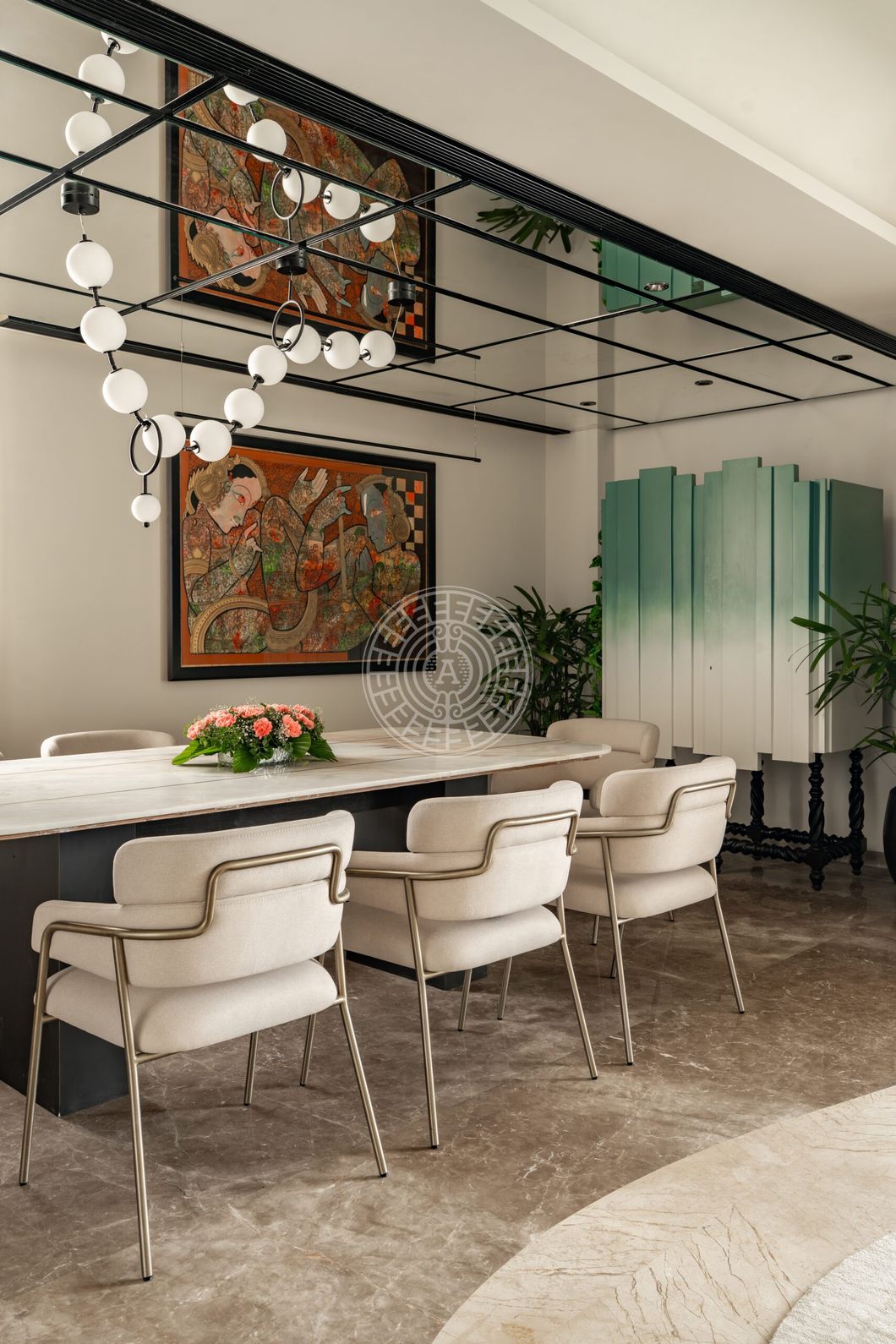 The duplex was transformed into a calm, light-filled home where pastel colours, white panelled walls, and earthy finishes create a serene atmosphere. Clever design elements like the mirror ceiling in the dining area enhanced the sense of height, while art, plants, and soft furnishings brought warmth and vibrancy, making the home feel open, spacious, and perfectly suited to the family’s lifestyle.