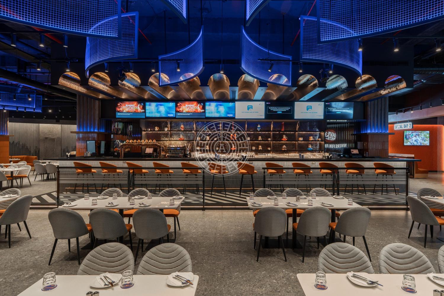 This 22,000 square foot gaming and entertainment space in Mumbai was all about creating an immersive play zone for adults. From a full-scale bowling alley with interactive projection lanes to game-inspired design features like a Tetris wall, Pac-Man entrance, and checked coffered ceilings, every detail was built around the idea of fun. Even functional elements like AC grills and wall finishes were turned into design features. The result is a space that feels dynamic, playful, and true to the spirit of gaming.