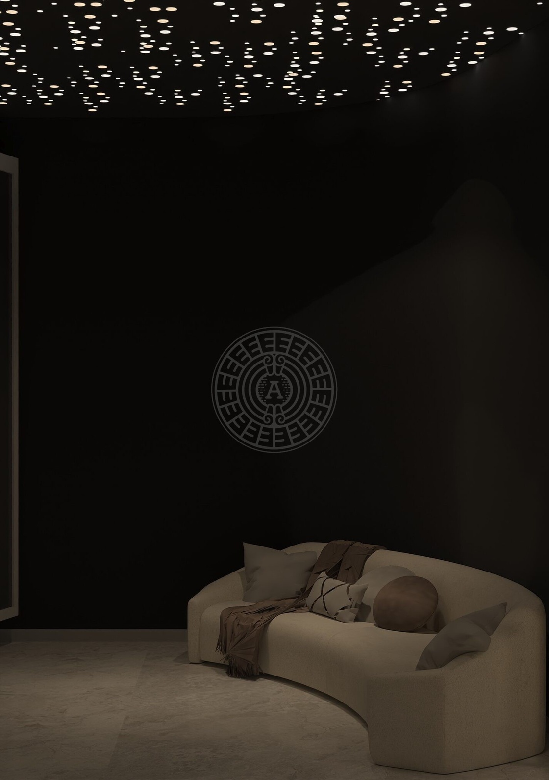 ● The sales office, on the other hand, had to embody both functionality and the company’s brand. The signature blue was brought to life through furniture accents that stand out against earthy rugs and a striking floor pattern. Warmth was introduced through a ceiling design that softened the strong visual identity. A key highlight of the office is the immersive 360° Pod, designed with moody indirect lighting and a cinematic atmosphere, where visitors can watch a short video about the company’s vision and work. The brand development area continued this story, with organic furniture forms complementing a history wall that displayed the company’s timeline in an engaging and accessible way.