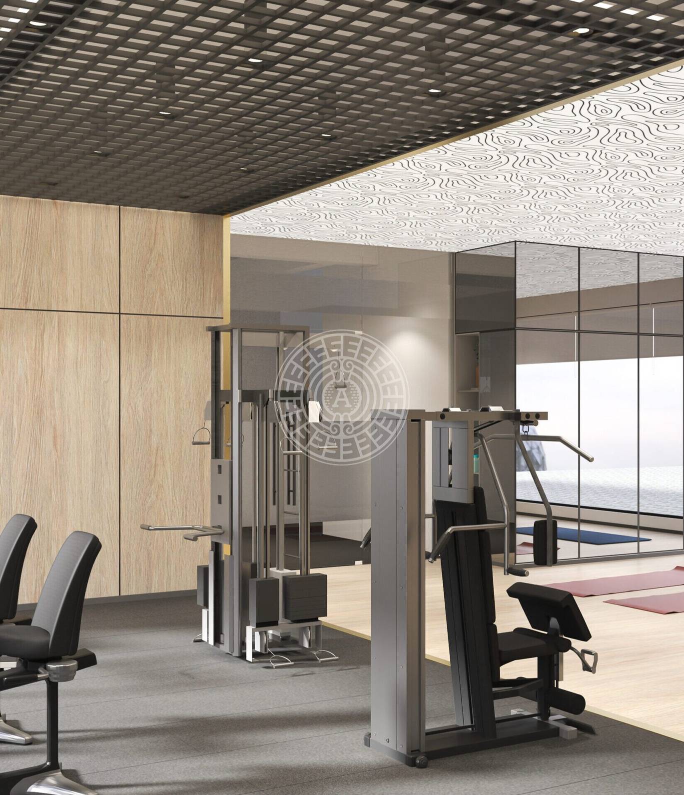 ● The amenities floor was envisioned as a functional yet inviting space where residents could feel comfortable every time they visited. Its defining design feature is the stretched ceiling, with patterns that flow seamlessly across the interiors. In the games and theatre rooms, functionality meets creativity with acoustic panelling in a striking red that creates energy while balancing the presence of the company’s blue.