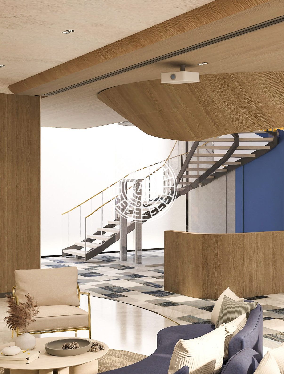 The reception lobby was designed as the first point of connection, setting the tone for the entire project. Its earthy elevation establishes a sense of warmth while subtly reflecting the company’s signature blue, ensuring a clear design connection to the sales office beyond. A striking blue panelling leads visitors toward the elevators, reinforcing brand identity in a bold yet elegant way. The organic quality of the space comes through in the reception seating, where curved sofas and a sculptural centre table create a welcoming atmosphere that feels both contemporary and inviting.