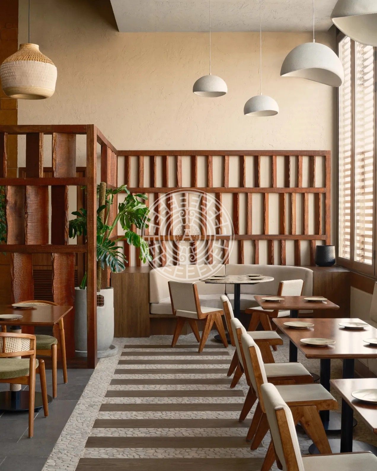 Rü in Hyderabad is a fine dining space designed to feel grounded and easy from the moment you walk in. The lobby sets the tone with checkered flooring and a staircase that draws you in. Warm wood, stone, cane, and soft lighting create dining areas that feel calm and inviting. The indoor rooftop with hand-knotted ropes adds texture and warmth. It’s a restaurant that doesn’t try too hard, but stays with you because of how it feels.