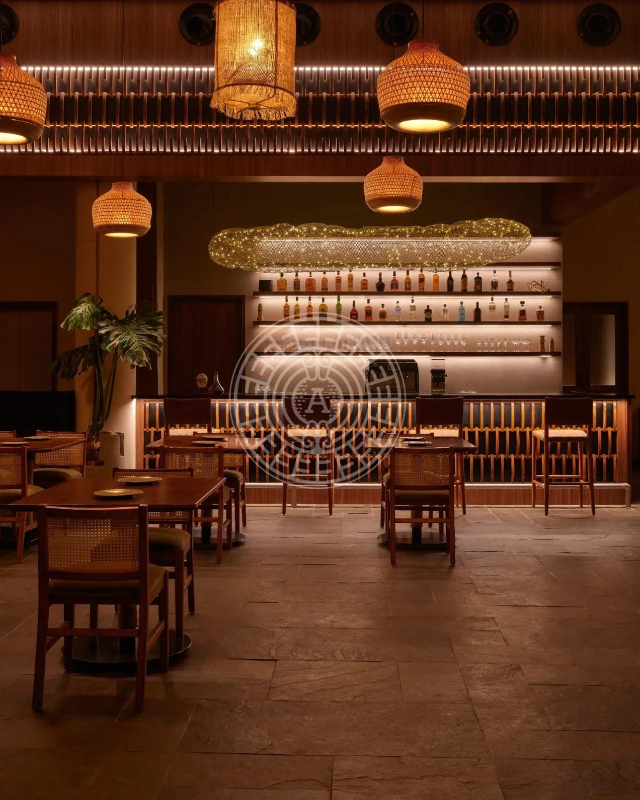 Rü in Hyderabad is a fine dining space designed to feel grounded and easy from the moment you walk in. The lobby sets the tone with checkered flooring and a staircase that draws you in. Warm wood, stone, cane, and soft lighting create dining areas that feel calm and inviting. The indoor rooftop with hand-knotted ropes adds texture and warmth. It’s a restaurant that doesn’t try too hard, but stays with you because of how it feels.