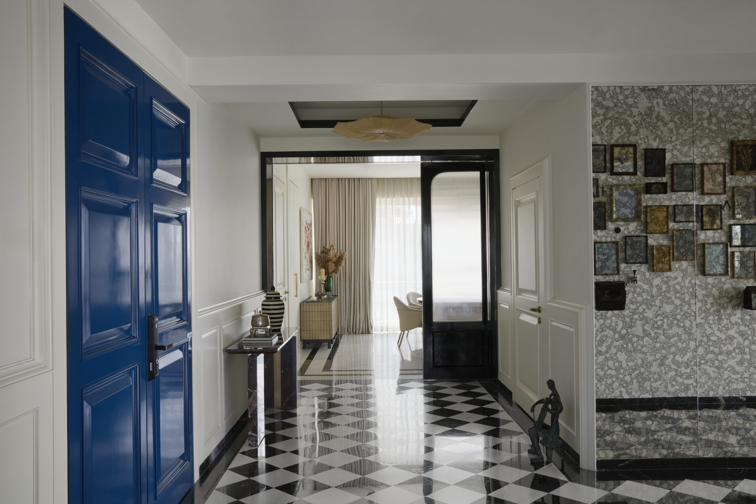 The concept for this space was rooted in the philosophy of yin and yang - a reflection of two contrasting aesthetics, brought together in a unified design language. The black and white checkered flooring, laid across the entrance foyer and passage areas, became the foundation and starting point of the design narrative.