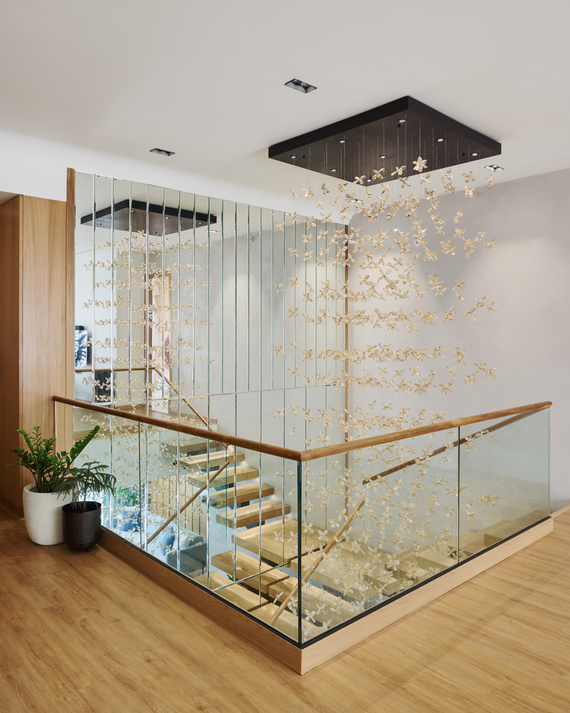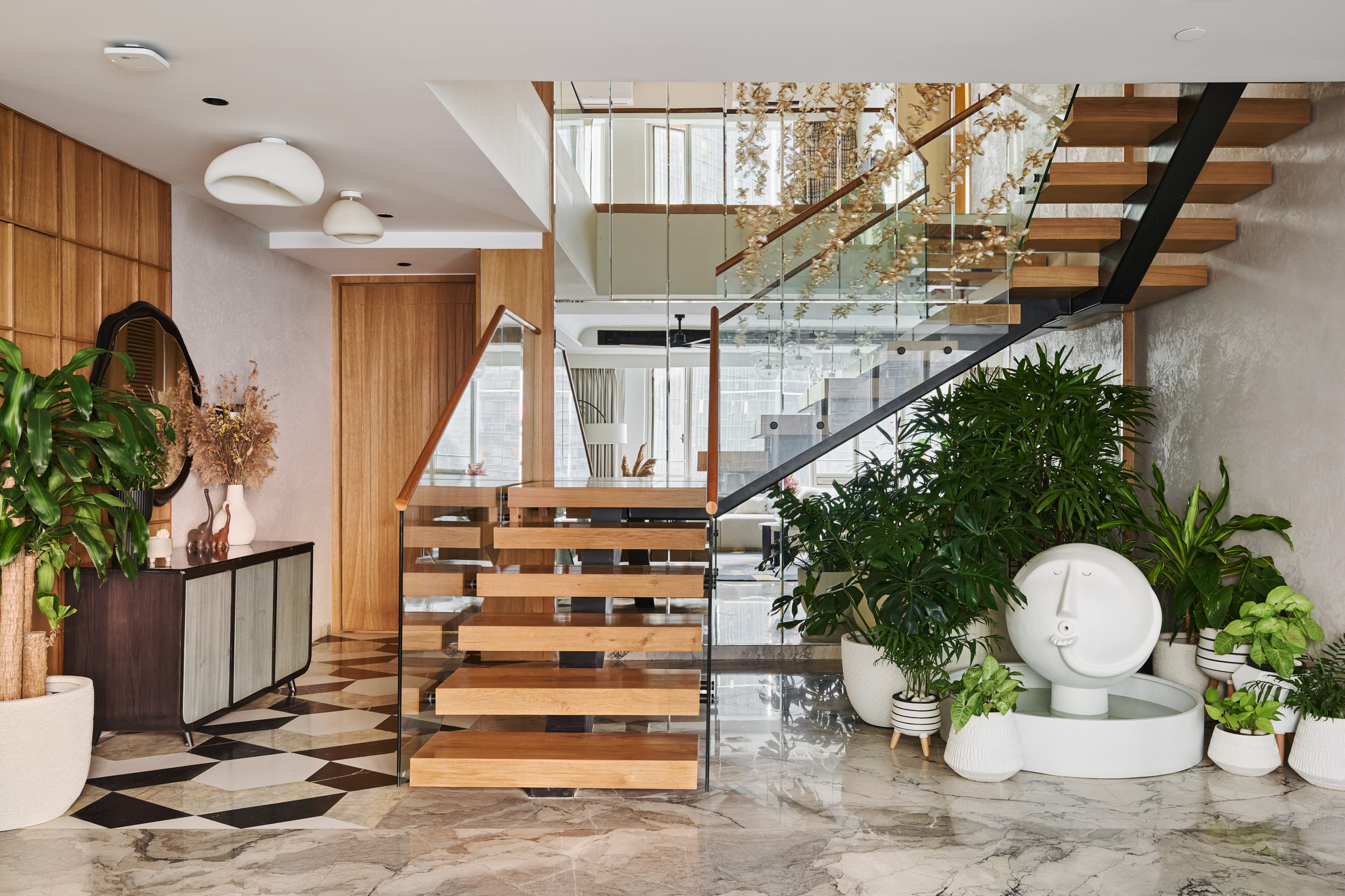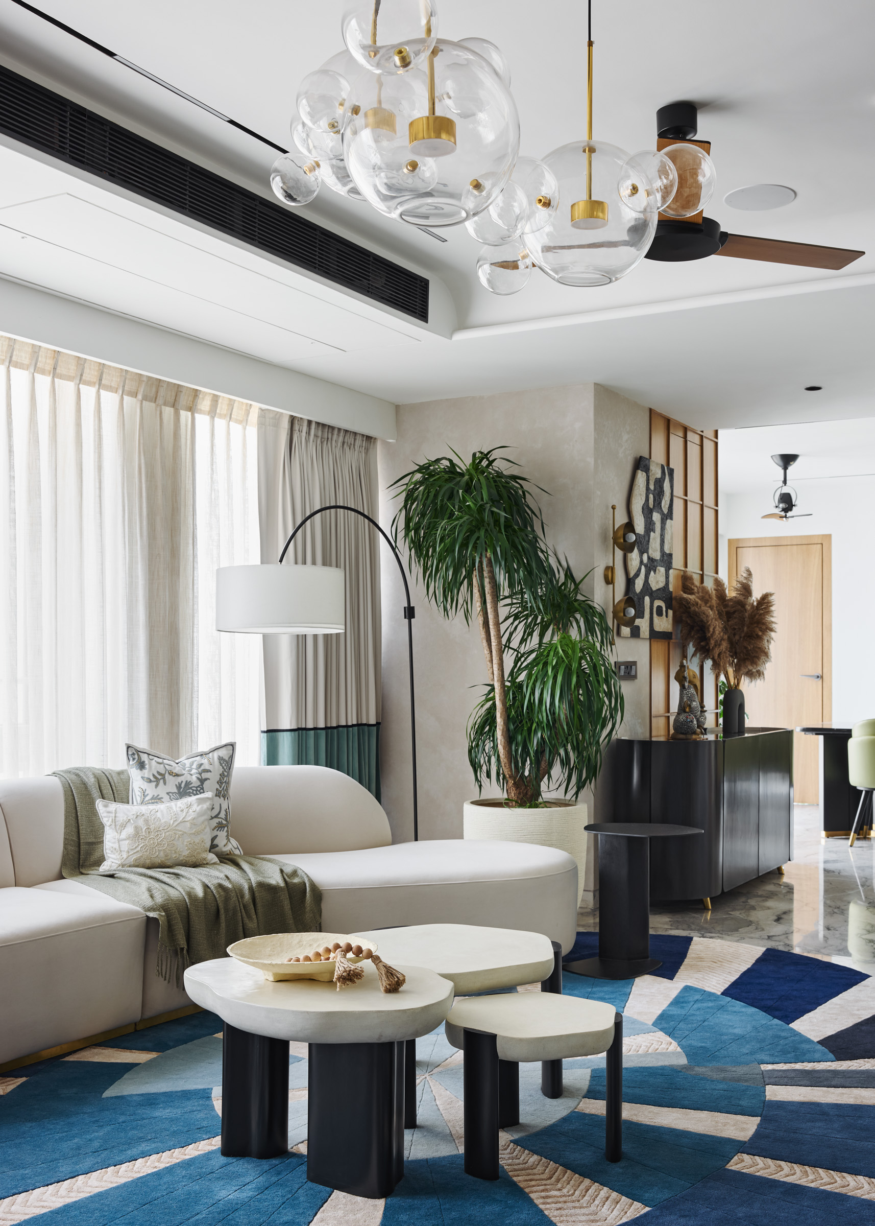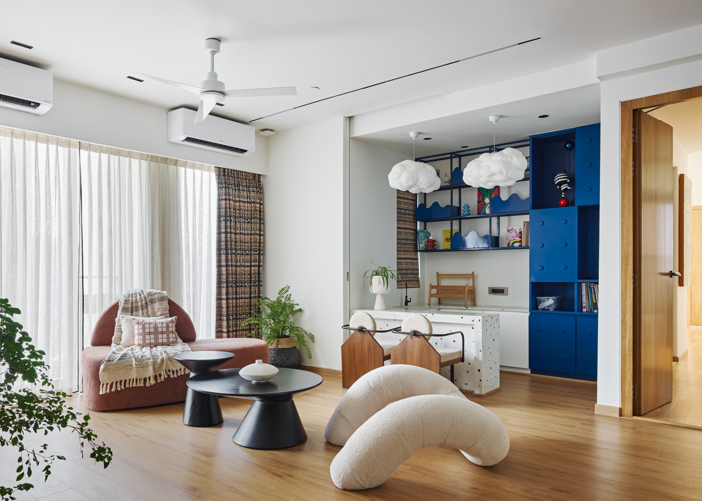 The concept for this project stemmed from our client’s desire for a home that radiates cheerfulness and modernity while maintaining a serene and refined atmosphere. We approached this by merging two 3 BHK flats into one expansive duplex, allowing us to create distinct spaces with unique identities yet maintaining a cohesive overall theme.