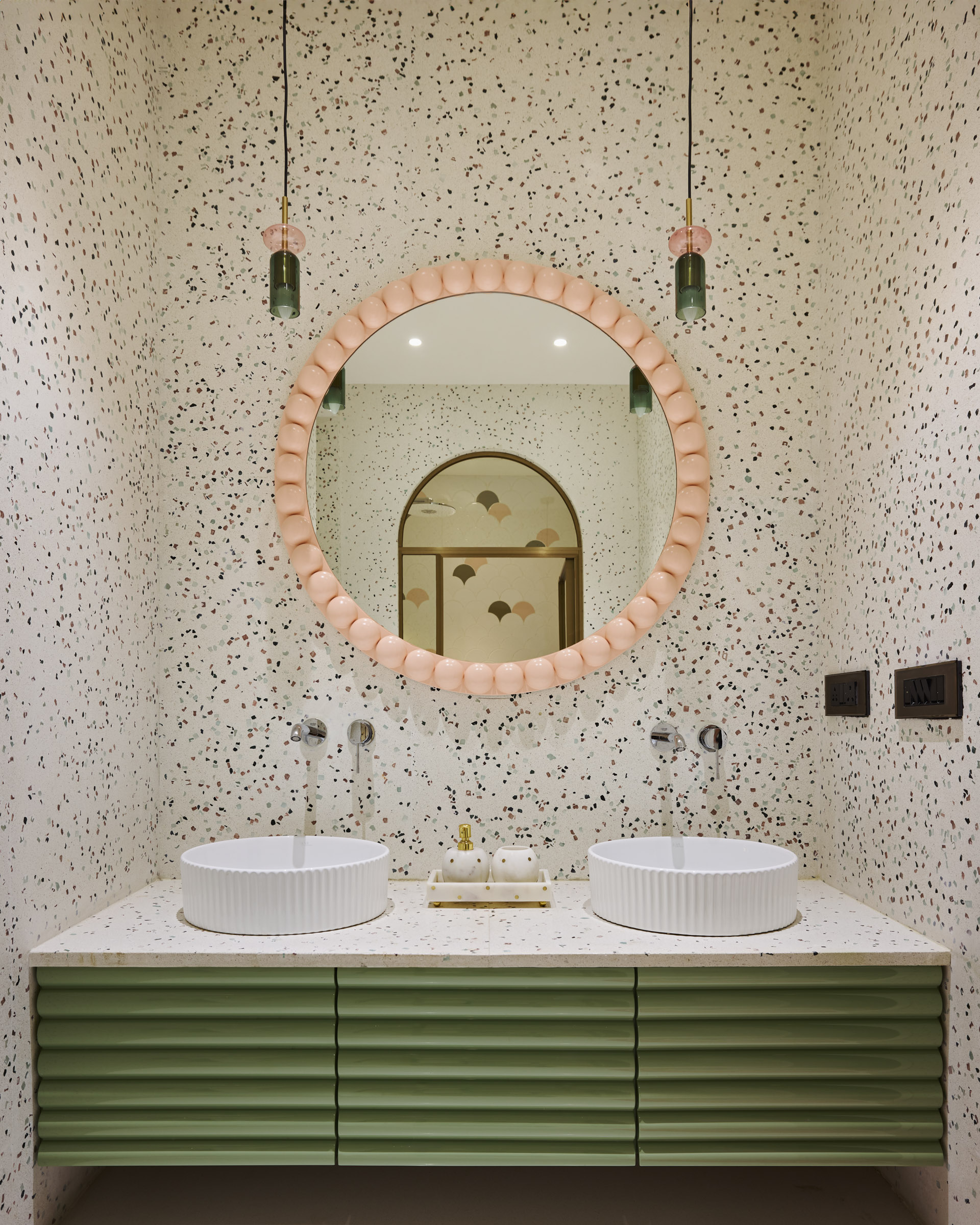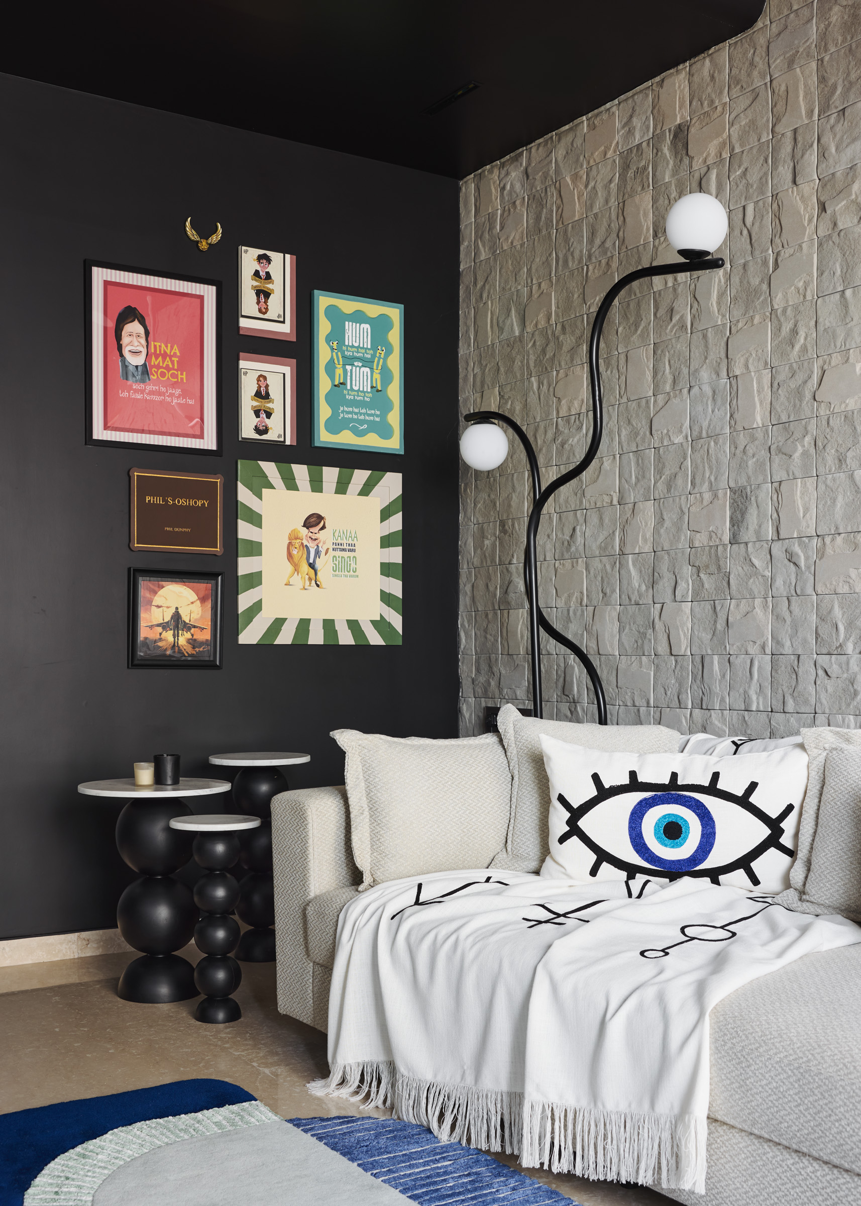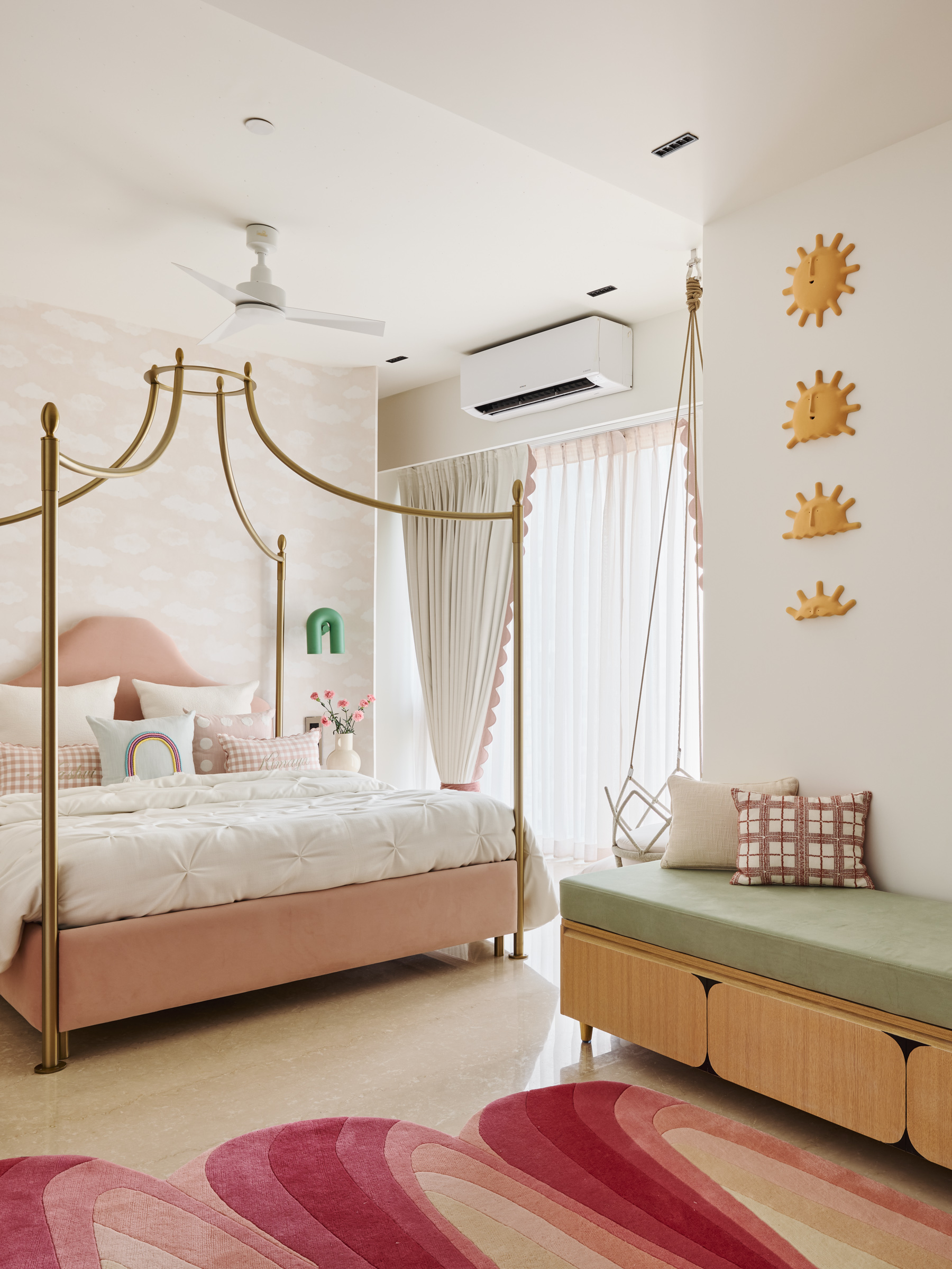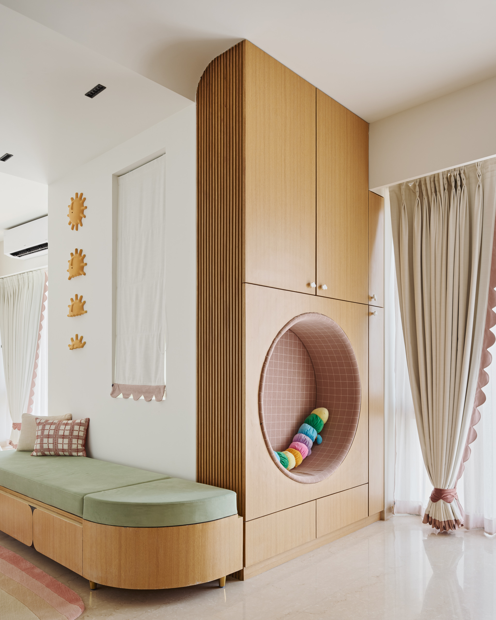 This duplex in Mumbai was designed to feel personal and connected in every space. The entertainment room brings in bold black walls with a striking blue rug, while the dining area pairs a marble table with soft sage chairs. The master suite is simple and elegant, and the grandmother’s room has rattan furniture and green tiles that add so much character. Thoughtful details like a floating mandir and personalized artwork make the home truly unique to the family.