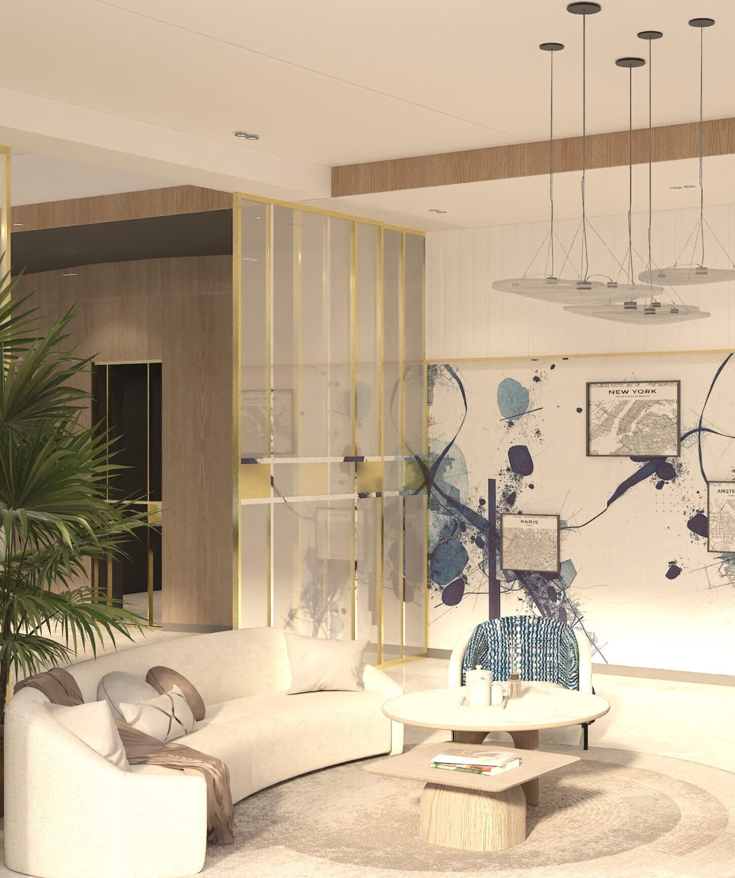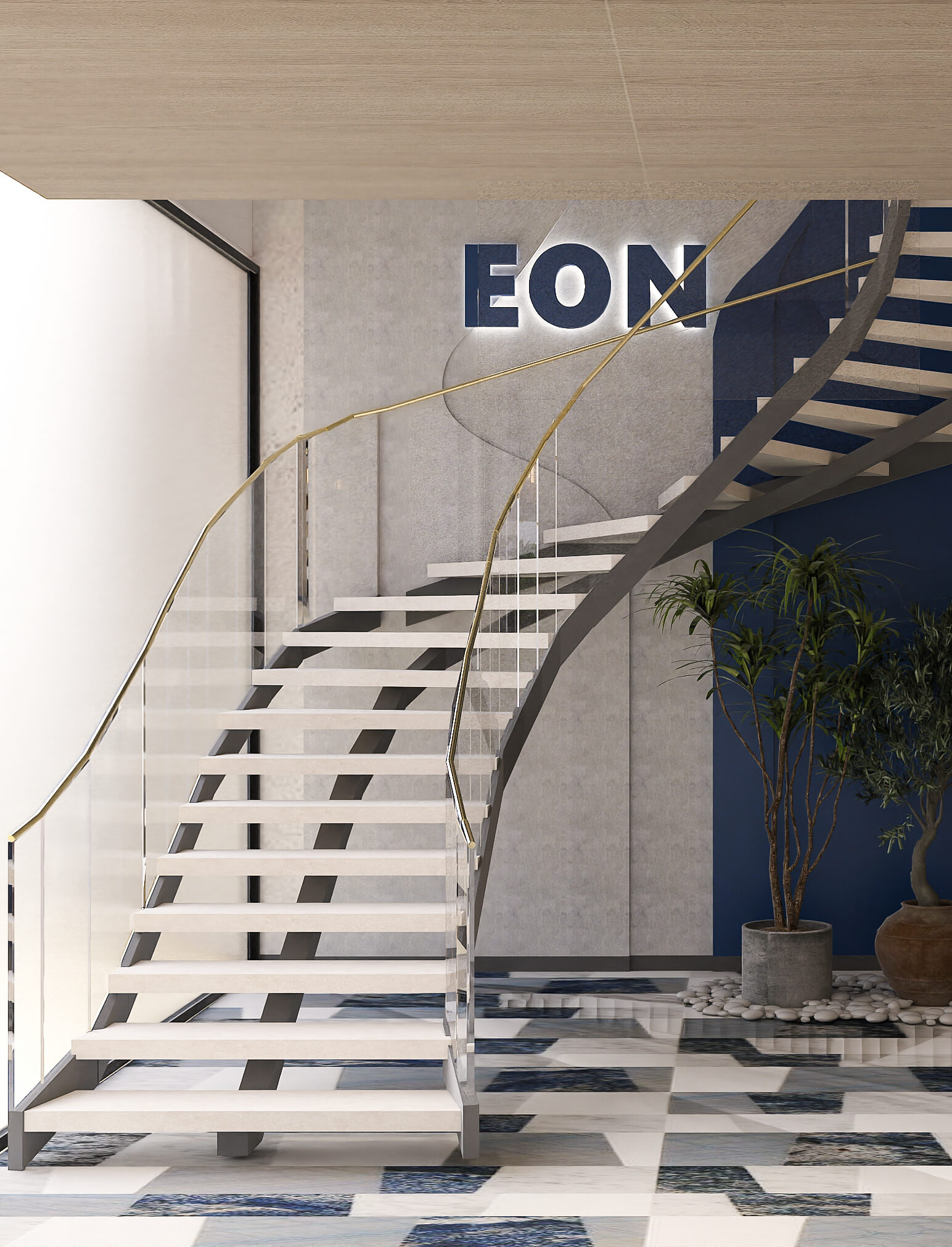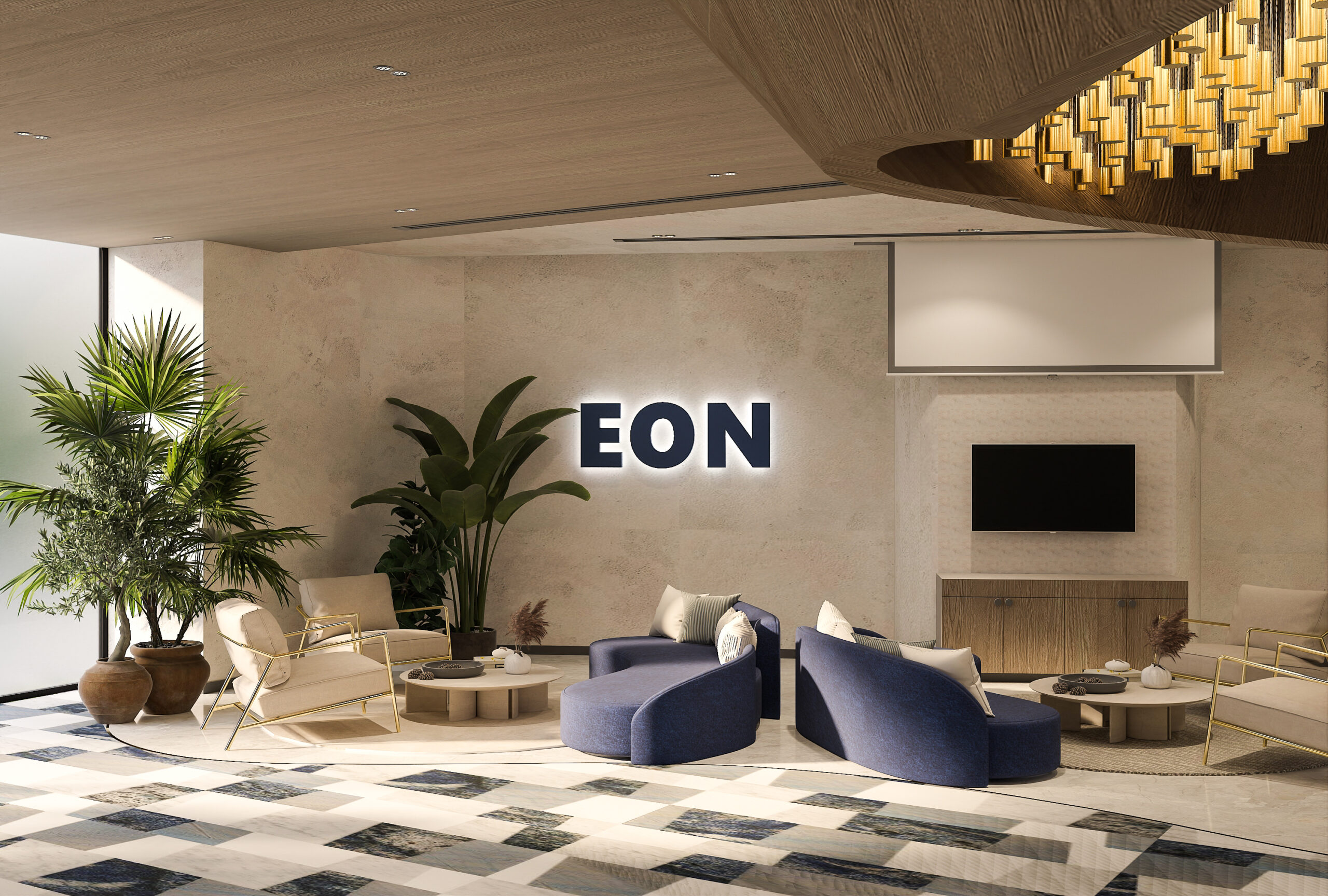 This sea-facing show apartment for EON was designed to feel bold yet inviting, with their signature blue woven throughout. The living area has custom details like a laser-cut AC vent with soft lighting and a warm palette of greys, whites, and browns. The bedrooms balance muted tones with sleek closets and a full blue story with art, pillows, and curtains. From playful bathroom tiles to a chandelier in the foyer, every detail reflects the brand while still feeling like a home.