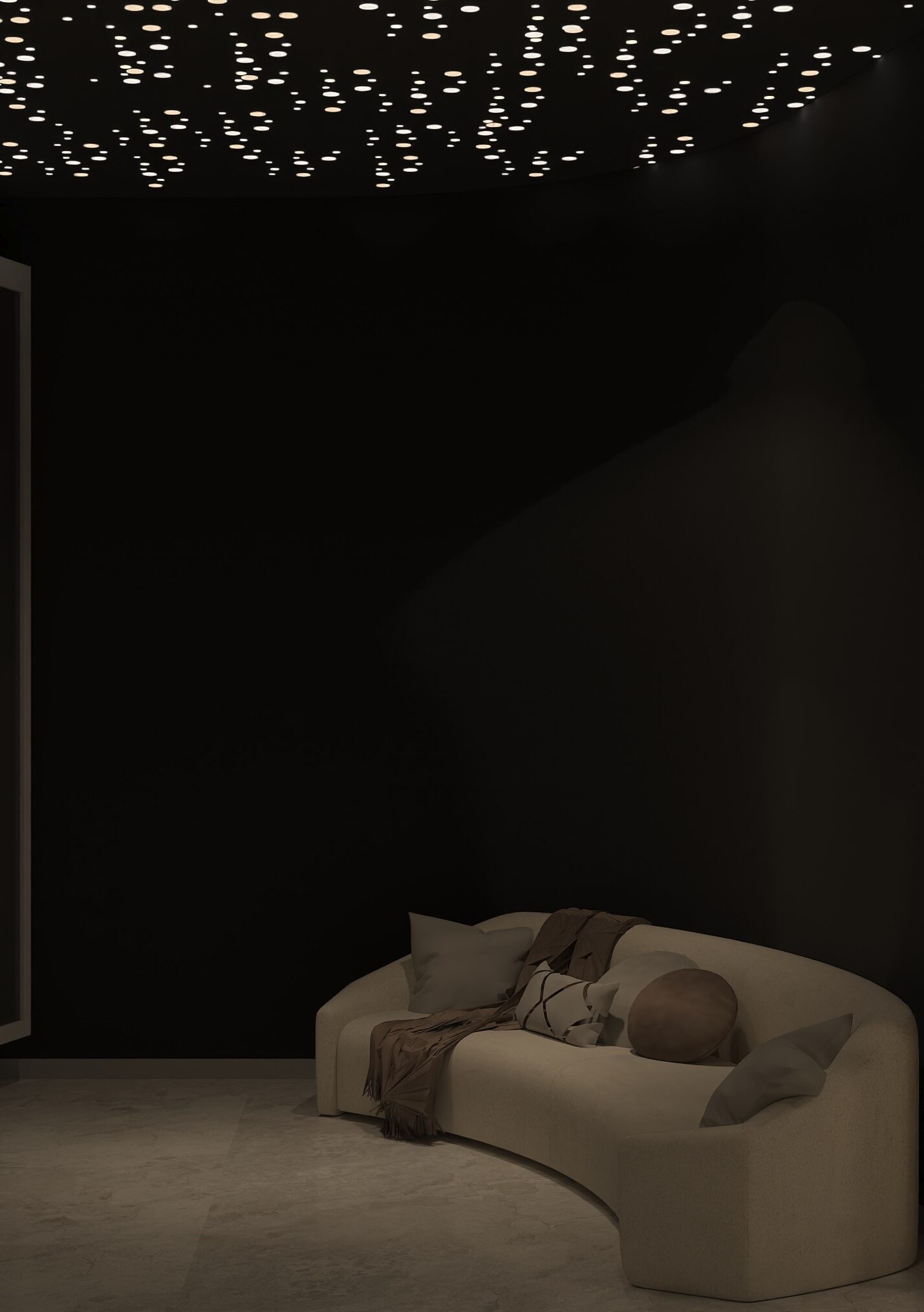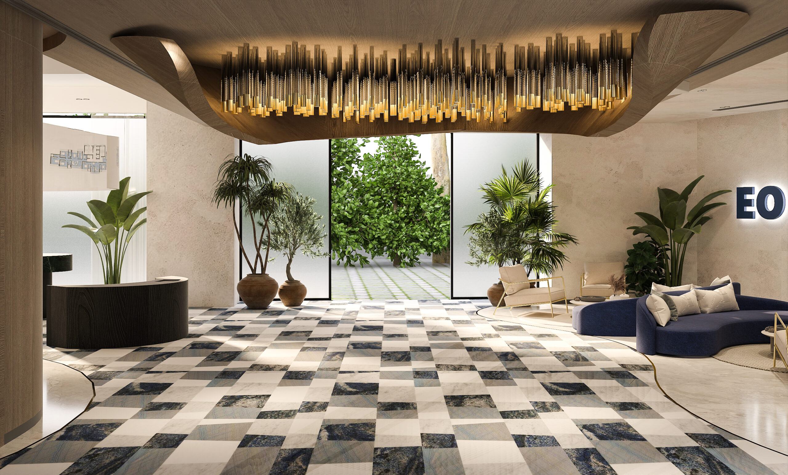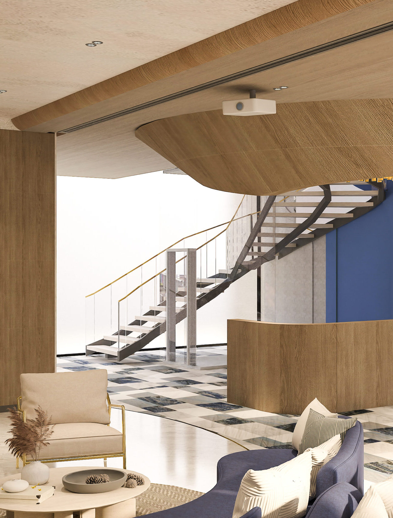 This sea-facing show apartment for EON was designed to feel bold yet inviting, with their signature blue woven throughout. The living area has custom details like a laser-cut AC vent with soft lighting and a warm palette of greys, whites, and browns. The bedrooms balance muted tones with sleek closets and a full blue story with art, pillows, and curtains. From playful bathroom tiles to a chandelier in the foyer, every detail reflects the brand while still feeling like a home.